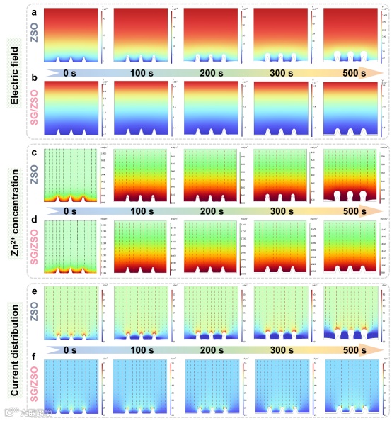 图 3 多物理场动态模拟:a, b) ZSO 和 SG/ZSO 电解质中的电场分布;c, d) Zn2+ 浓度;e, f) 电流分布。