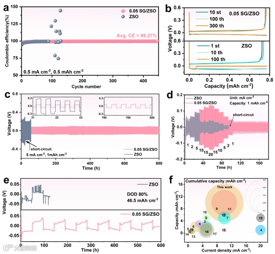 图 5 a) ZSO 和 SG/ZSO 电解质中的锌/铜电池在 0.5 mA cm-2 和 0.5 mAh cm-2 下的循环性能,以及 b) 不同循环下的相应电压曲线。d) 不同电流密度下的速率性能。e) ZSO 和 SG/ZSO 电解质中的锌//锌电池在 80% DOD 条件下的循环性能。f) SG/ZSO 系统与之前报道的电解质添加剂的比较。
