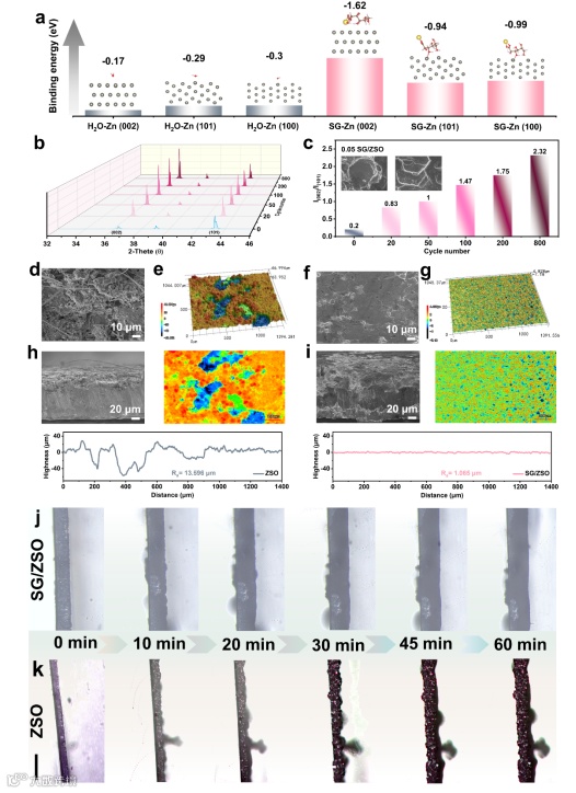 图 2 a) 优化吸附模式下 H2O 和 SG 在不同 Zn 晶体平面上的结合能比较。b) ZSO 和 SG/ZSO 电解质中的 Zn 阳极在 1 mA cm-2 和 1 mAh cm-2 下不同循环后的 XRD 图谱。c) 不同电解质下循环 Zn 电极 (002)/(101) 平面的强度比较以及内部 002-六边形图示。在 1 mA cm-2 和 1 mAh cm-2 条件下,在 d, h) ZSO 电解质和 f, i) SG/ZSO 电解质中循环的 Zn 电极的扫描电镜(俯视和侧视)图像。e, g) 在 ZSO 和 SG/ZSO 电解质中循环的 Zn 的共聚焦激光扫描显微镜(CLSM)图像和相应的表面粗糙度曲线。j) 含 SG 电解质和 k) ZSO 电解质中 Zn 沉积的局部放大原位光学显微镜观察。