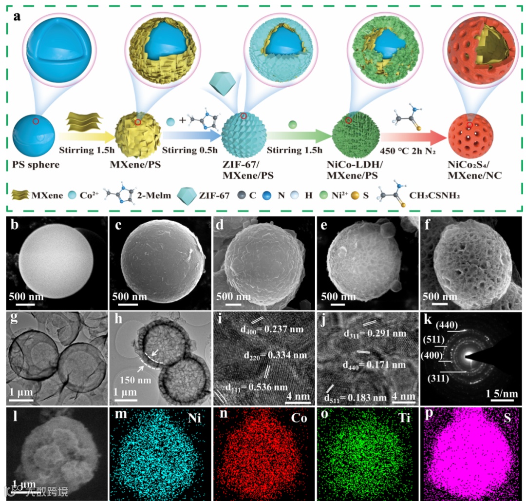 图1. (a) NiCo2S4/MXene/NC制备流程示意图;(b-f) 制备每个阶段的SEM图像;TEM图像:(g) MXene/NC,(h-k) NiCo2S4/MXene/NC。