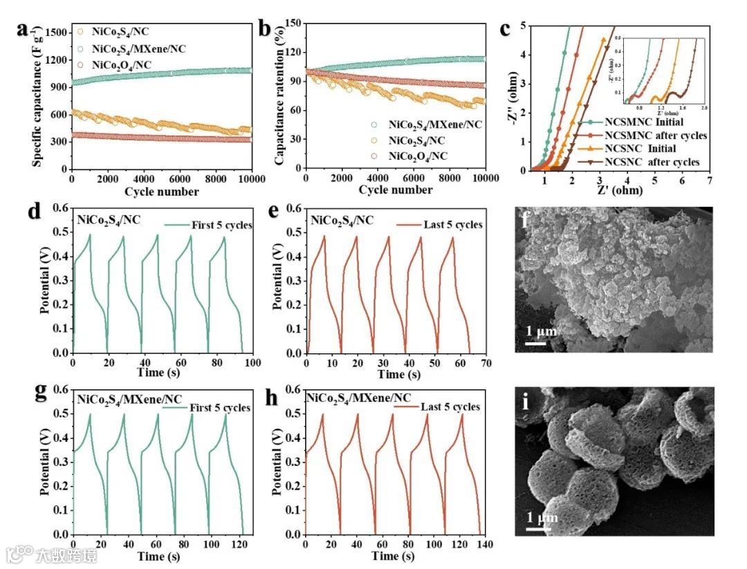 图2. NiCo2S4/MXene/NC和NiCo2S4/NC稳定性测试:(a-b, d-e, g-h) 10,000次电化学循环性能;(c) 循环前后EIS曲线;(f, i) 循环后电镜图。