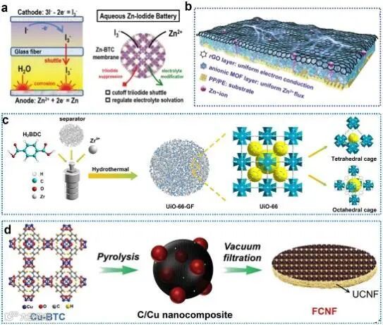隔膜的改性策略受到常见商用隔膜材料的内在特性的限制。新型隔膜的开发可以满足 ZIB的特定功能。一些具有较好结构特性、物理性能和机械强度的材料成为新型隔膜的候选材料。复合隔膜可以通过引入各种材料来形成,例如金属有机框架 (MOF)、MXenes 和 nafion。此外,虽然常用的商用隔膜,如纤维素基隔膜和无纺布隔膜,已在其他电池系统中得到广泛研究,但它们在ZIB中的研究有限。基于这些新型复合隔膜的电池系统在比容量、倍率性能和循环寿命方面表现出更好的电化学性能,这一部分分析并讨论了适用于水系锌电的新型隔膜的开发。