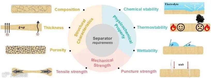 在电池系统中,隔膜被认为是关键部件,因为它用作电解质的储存器以介导离子的传输路径,并产生物理隔离以防止在充电/放电过程期间电池短路。它的微观结构和物理化学性质对电池的电化学性能、使用寿命和安全性有显著影响。综述阐述了从隔膜的结构特性、物理化学特性、机械强度三个方面对水系锌离子电池的影响,包括隔膜的组成、厚度、孔隙率、耐热性、稳定性、润湿性、抗拉强度、穿刺强度。