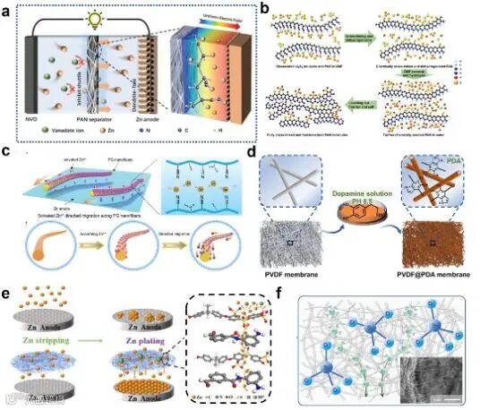 对现有的且价格低廉的隔膜(如滤纸)进行改性可以解决电极界面的问题,提升电池性能。作者总结了目前用于改性隔膜的策略三个基本出发点,即均匀沉积、离子扩散调节和电极保护,这一部分重点关注电极/电解质界面(EEI)上的各种离子电化学行为以及优化策略。
