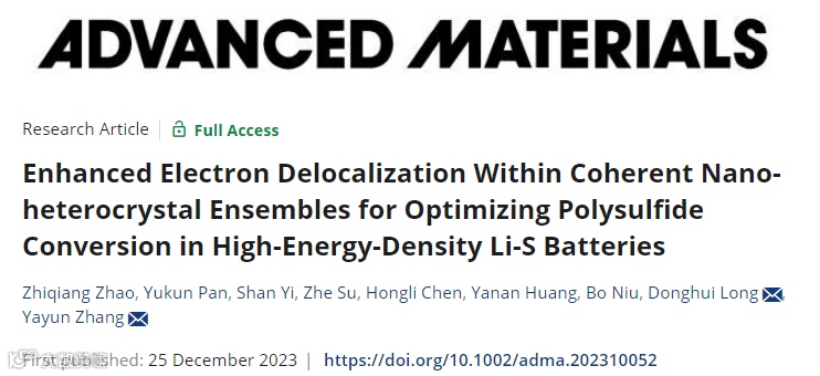 近日,华东理工大学的张亚运副教授和龙东辉教授团队在国际知名期刊《Advanced Materials》上发表了题为《Enhanced Electron Delocalization Within Coherent Nano-heterocrystal Ensembles for Optimizing Polysulfide Conversion in High-Energy-Density Li-S Batteries》的研究工作。该研究提出了一种拼图式催化剂设计策略,通过原位组装NbN-NbC共格纳米异质晶群(CNEs),以稳定高活性晶面并降低相关反应能垒。稳定的高活性晶面促使多硫化物聚集,同时具有增强活性的周围表面晶面促进锂离子的硫化物沉积和扩散,从而协同促进了连续高效的硫氧化还原反应,提高了电池的耐久性能和能量密度。在实际应用中,基于CNEs的软包装电池实现了357 Wh kg−1的高能量密度。