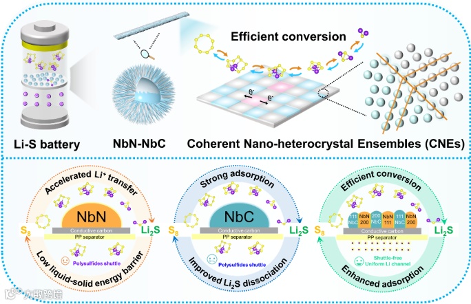 图1. 共格纳米异质晶群CNEs的制备及在Li-S电池中的作用机制示意图