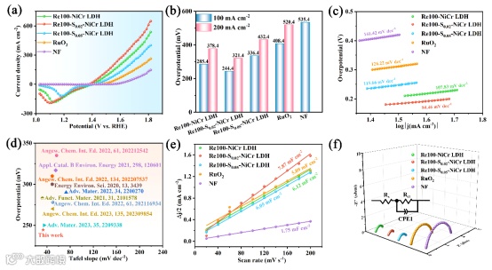 图2 Re100-NiCr LDH、Re100-S0.02-NiCr LDH、Re100-S0.05-NiCr LDH、RuO2和NF在100次CV循环后的OER 性能:(a)LSV曲线,(b)在100和200 mA cm-2下的过电位,(c)Tafel图,(d)Re100-S0.02-NiCr LDH与文献报道的Tafel斜率和过电位比较,(e)电容电流与扫描速率的关系,(f)Nyquist图。