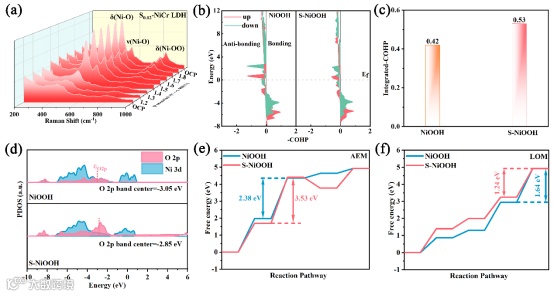 图5 (a)S0.02-NiCr LDH的原位Raman,NiOOH和S-NiOOH的(b)Ni-O键的COHP,(c)-COHP到费米能级的积分值,(d)PDOS图,(e)AEM的吉布斯自由能图,(f)LOM的吉布斯自由能图