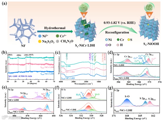 图1 (a)催化剂制备示意图,NiCr LDH、S0.02-NiCr LDH和S0.05-NiCr LDH的(b)XRD图,(c)FTIR图,NiCr LDH和S0.02-NiCr LDH的XPS光谱:(d)Cr 2p、(e)Ni 2p和(f)O 1s;(g)S0.02-NiCr LDH的S 2p XPS光谱。