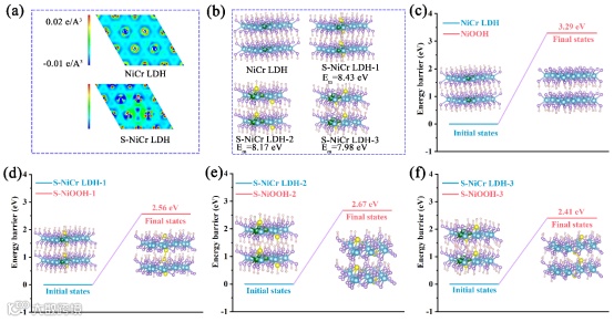 图4 (a)NiCr LDH和S-NiCr LDH的电子局域函数,(b)NiCr LDH和三种硫掺杂不同位点的结构模型和相应的形成能,(c)NiOOH,(d)S-NiOOH-1,(e)S-NiOOH-2,和(f)S-NiOOH-3的重构能垒。