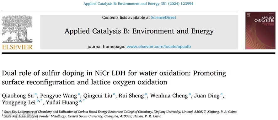 新疆大学黄玉代教授联合中南大学雷永鹏教授,在国际知名期刊Applied Catalysis B: Environment and Energy上发表题为“Dual role of sulfur doping in NiCr LDH for water oxidation: promoting surface reconfiguration and lattice oxygen oxidation”的文章。该文章报道了一种硫掺杂镍铬层状双氢氧化物(Sx-NiCr LDH)作为预催化剂,进行电化学活化。硫掺杂可以促进催化剂自重构和晶格氧氧化,展示出双重作用:硫取代了NiCr LDH中的氧,形成的Cr-S键具有较低的键能,使Cr更易浸出,而且硫掺杂降低了NiCr LDH的重构能垒,从而促进NiCr LDH重构为活性的NiOOH。另外,硫掺杂增强了Ni-O键的共价性,上移了O 2p带中心,促进晶格氧氧化。重构的催化剂在100 mA cm-2的电流密度下,过电位仅为244.4 mV。将重构的催化剂在25°C和80°C下进行水分解,在10 mA cm-2下分别需要1.51和1.47 V的电压。