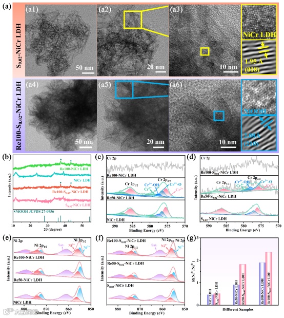 图3 S0.02-NiCr LDH和Re100-S0.02-NiCr LDH的(a)TEM图,ReC-NiCr LDH(C=0、50和100)和ReC-S0.02-NiCr LDH(C=0、50和100)的表征:(b)XRD图,(c,d)Cr 2p XPS光谱,(e,f)Ni 2p XPS光谱,(g)Ni3+与Ni2+的比率。