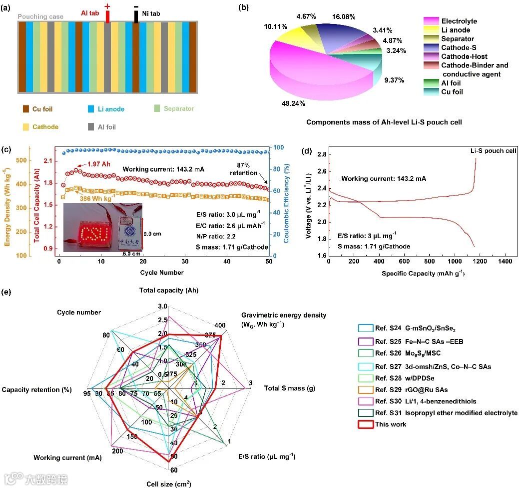 图6. 锂硫软包电池的组装与性能