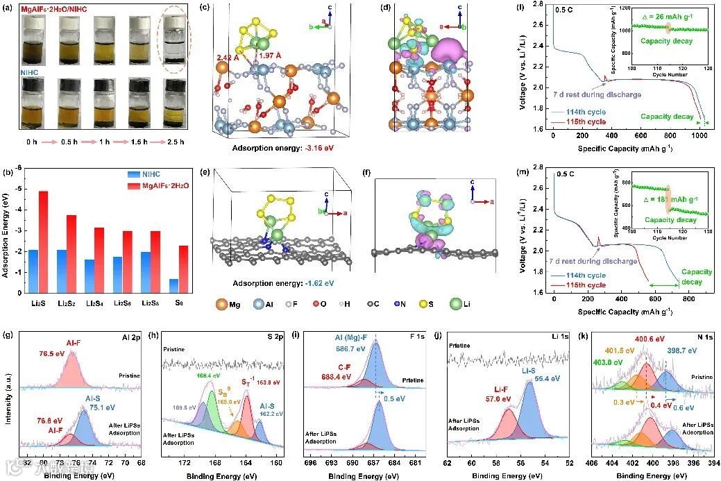 结合可视化吸附试验、DFT计算、吸附前后的XPS对比以及自放电测试等结果共同揭示了MgAlF5·2H2O/NIHC对多硫化物强的吸附作用,从而有效抑制了多硫化物的穿梭效应。MgAlF5·2H2O主要通过化学键合作用捕获多硫化物。