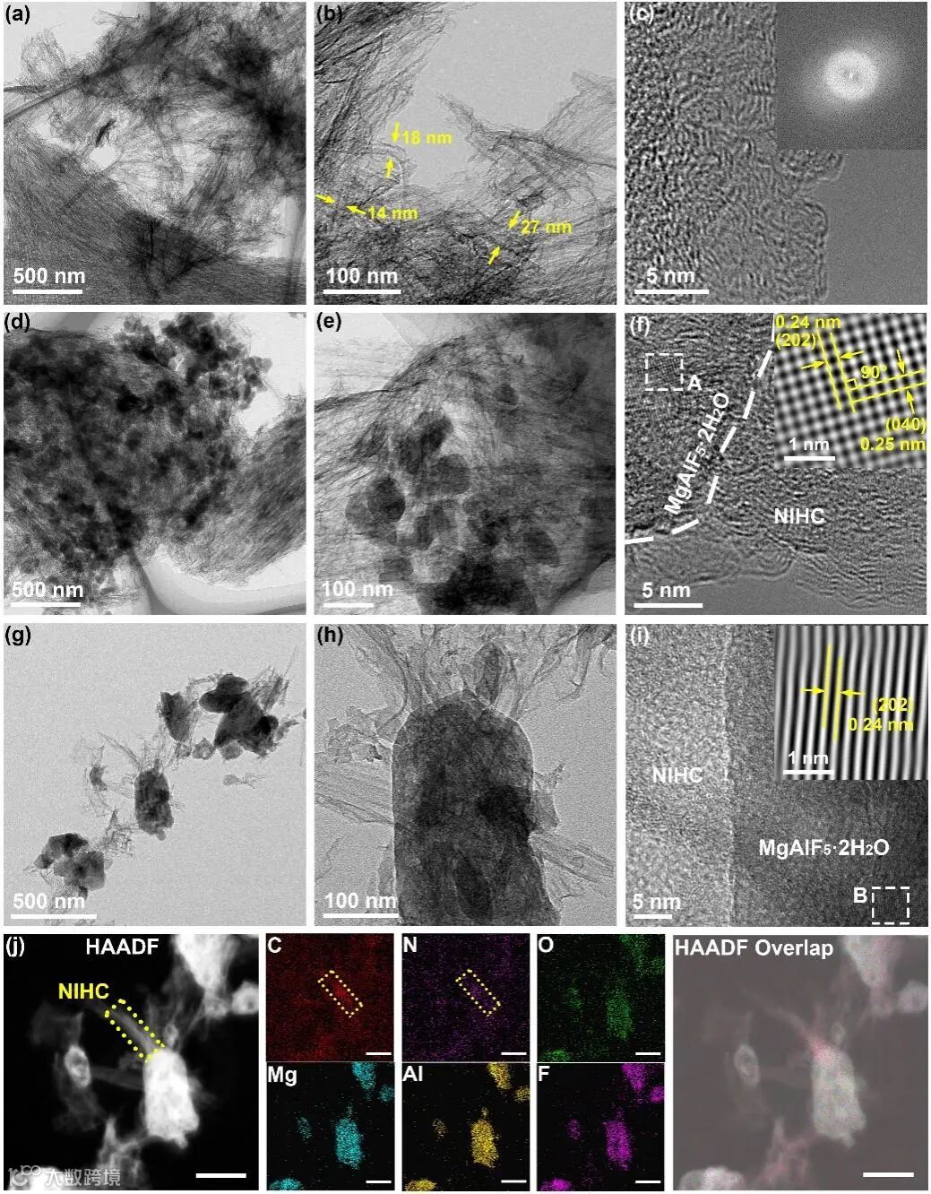 TEM图像显示了NIHC的空心骨架结构,具有相互连通的管状空腔,成功复刻了与H-Palygorskite纤维束模板互补的纳米结构。负载的MgAlF5·2H2O尺寸可控,随着水热反应时间的增加,MgAlF5·2H2O纳米颗粒逐渐变大,EDS结果表明H-Palygorskite模板被完全去除,N均匀地掺杂在C骨架中,而在纳米颗粒中Mg、Al、F和O元素均匀分布,它们的原子比接近MgAlF5·2H2O的理论化学计量比1:1:5:2。