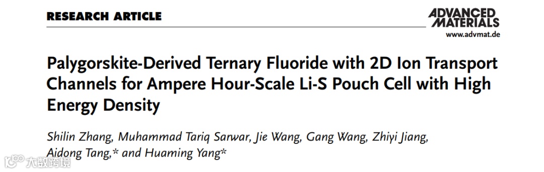 近日,来自中国地质大学(武汉)/中南大学的唐爱东、杨华明教授,在国际知名期刊Advanced Materials上发表题为“Palygorskite-Derived Ternary Fluoride with 2D Ion Transport Channels for Ampere Hour-Scale Li-S Pouch Cell with High Energy Density”的研究文章。该文章基于黏土矿物凹凸棒石衍生出一种具有快离子传输-强多硫化物捕获集成的新型三元氟化物MgAlF5·2H2O,锚定在具有连通管腔的氮掺杂空心碳骨架上(MgAlF5·2H2O/NIHC)。