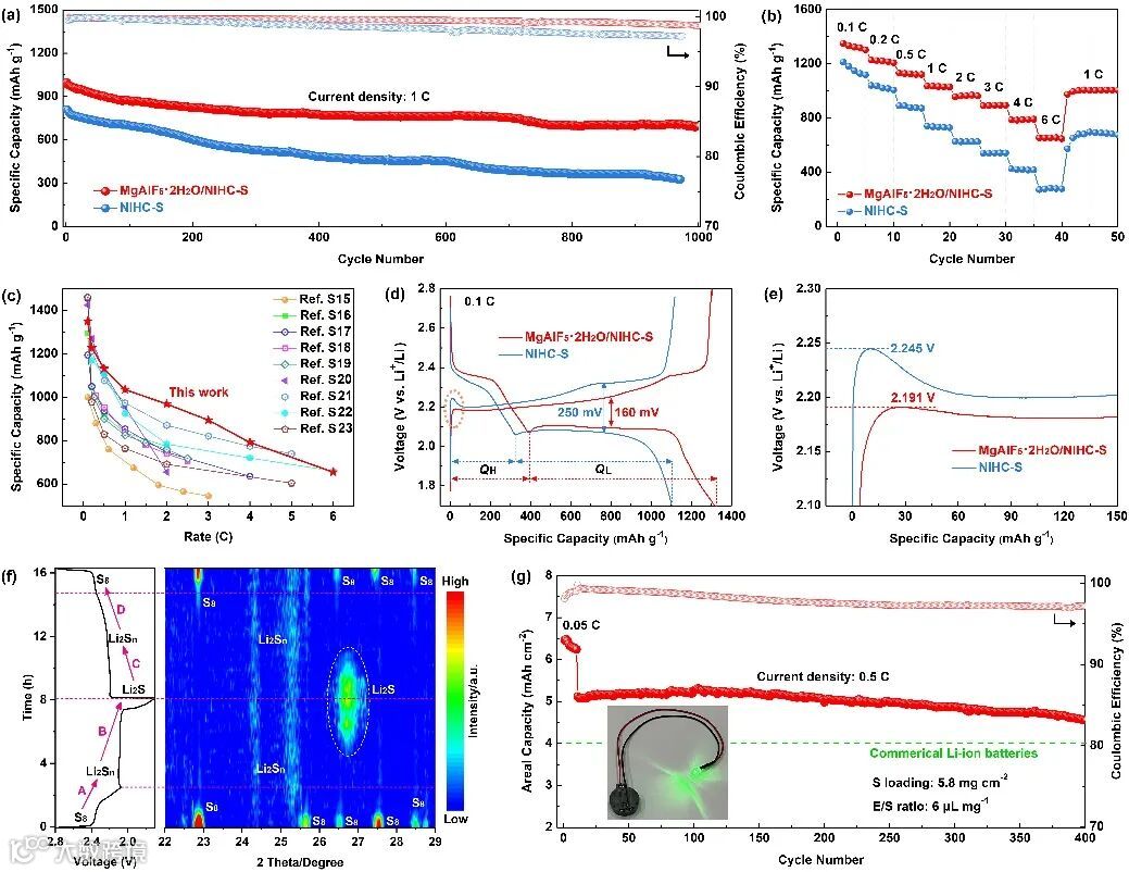 在83 wt%的硫含量下,基于MgAlF5·2H2O/NIHC-S的扣式电池在6 C的倍率时具有高达655 mAh·g-1的比容量,在1 C倍率下循环1000圈仍保持了695 mAh·g-1的比容量,单圈的容量衰减率低至0.03%。进一步制备了硫负载面密度为5.8 mg·cm-2的MgAlF5·2H2O/NIHC-S正极,在E/S比为6 μL·mg-1的条件下进行扣式电池测试。MgAlF5·2H2O/NIHC-S在0.05 C的倍率下的初始面比容量高达6.5 mAh·cm-2,在0.5 C的倍率下循环400圈后的容量保持率高达90%,在第400圈的可逆面比容量为4.6 mAh·cm-2,仍然高于商用锂离子电池(4.0 mAh·cm-2)。基于MgAlF5·2H2O/NIHC-S组装的软包电池在低E/S(3.0 μL·mg-1)、低N/P(2.2)、低E/C(2.6 μL·mAh-1)和高硫负载(1.71g)的条件下,可实现1.97 A·h的电池容量和386 Wh·kg-1的能量密度。