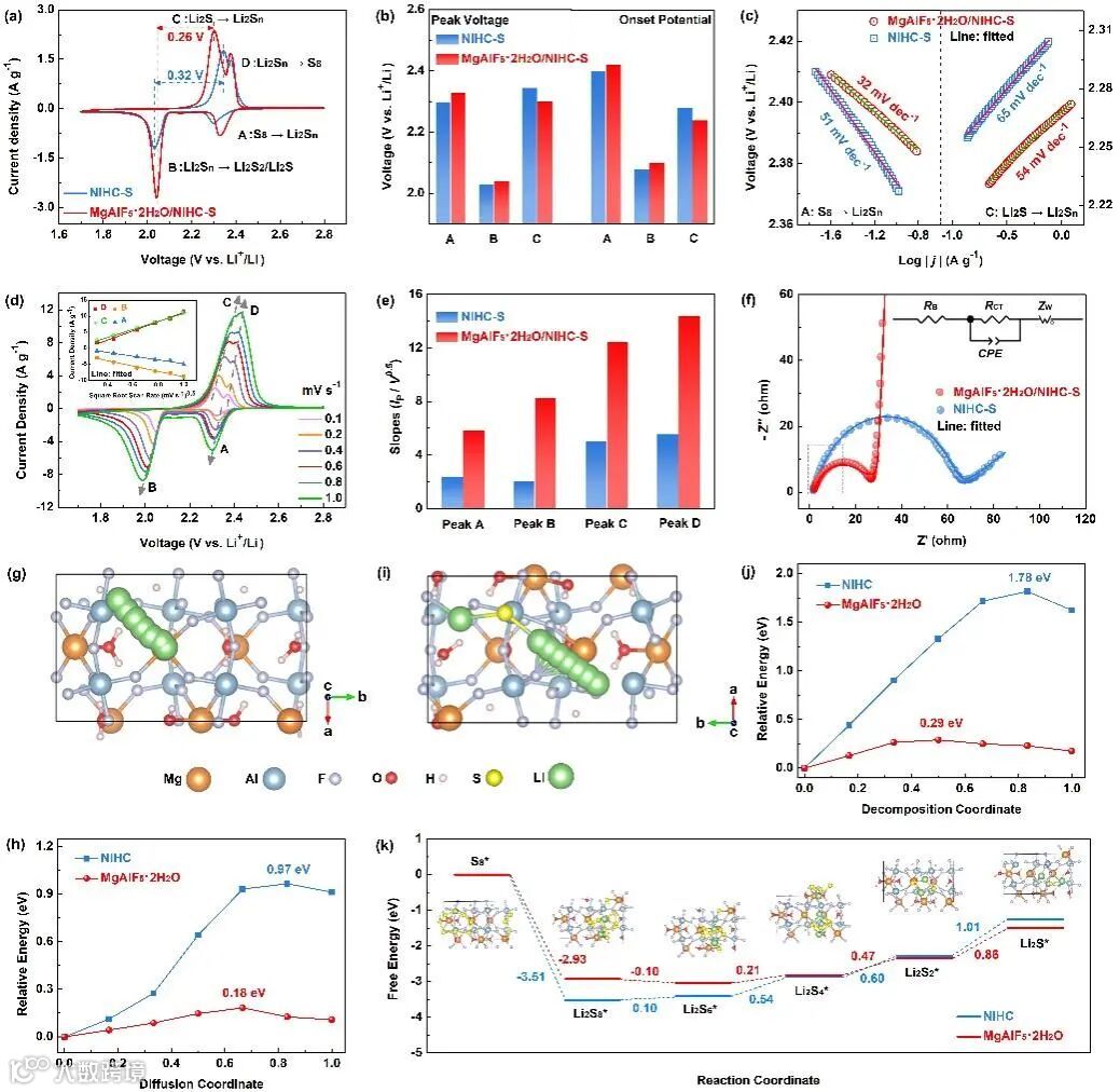 循环伏安曲线(CV)与Tafel斜率结果表明MgAlF5·2H2O的存在加速了锂硫电池的电化学氧化还原反应动力学。CV曲线中4个峰的峰值电流与扫描速率平方根之间存在线性关系,可以用Randles-Sevcik方程来描述,MgAlF5·2H2O/NIHC-S中4组峰所拟合的斜率值都大于NIHC-S,表明在MgAlF5·2H2O/NIHC-S中锂离子的扩散系数更高,MgAlF5·2H2O的存在促进了锂离子的扩散。利用Climbing image nudged elastic band方法研究揭示了相比于NIHC,在MgAlF5·2H2O上锂离子的扩散势垒与Li2S的分解势垒更小,表明MgAlF5·2H2O的存在增强了锂离子的扩散,加速了Li2S的氧化。计算的吉布斯自由能显示了MgAlF5·2H2O的存在促进了硫的转化反应(从S8逐步还原为Li2S)。