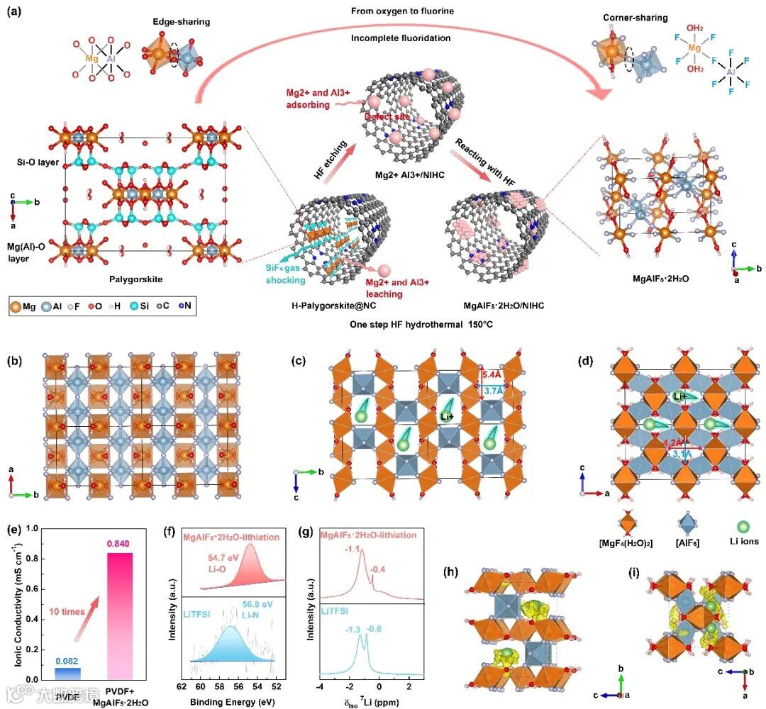 通过氢氟酸水热法150°C处理氮掺杂碳包覆酸改性凹凸棒石,去除凹凸棒石模板的同时,充分利用凹凸棒石中浸出的镁铝离子与过量的氢氟酸反应,获得一种反Weberite型三元氟化物MgAlF5·2H2O锚定在具有连通管腔的氮掺杂空心碳骨架上(MgAlF5·2H2O/NIHC)。MgAlF5·2H2O具有反Weberite型晶体框架,其中角共享的[AlF6]-[MgF4 (H2O)2]八面体单元延伸形成了分别沿[100]和[010]方向的二维锂离子通道。锂化MgAlF5·2H2O基离子导体在25℃时展现出0.84 mS·cm−1的高离子电导率,从头算分子动力学模拟揭示了其中锂离子的传导路径沿着通道且靠近[MgF4 (H2O)2]八面体的-OH2顶点位。