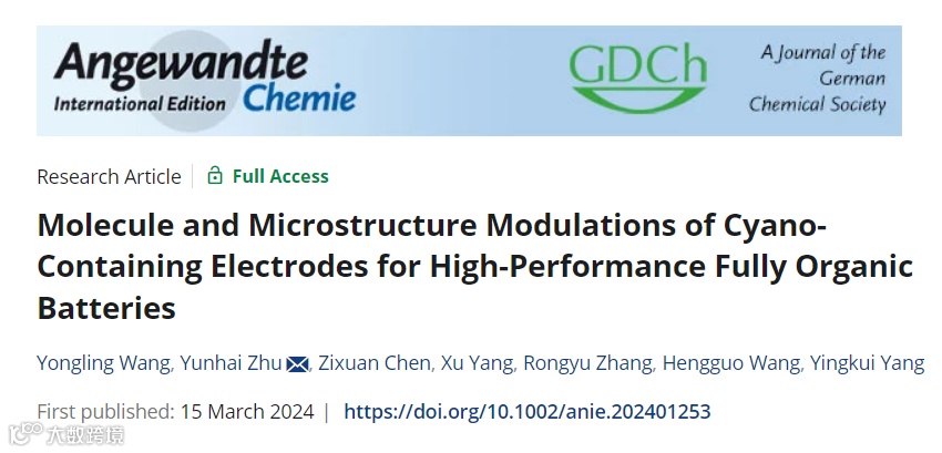 近日,来自武汉纺织大学的杨应奎教授、朱云海教授和沈阳航空航天大学的张蓉瑜博士合作,在国际知名期刊Angewandte Chemie上发表题为“Molecule and Microstructure Modulations of Cyano-containing Electrodes for High-Performance Fully Organic Batteries”的研究文章。该文章以小分子氰基化合物-对苯二氰基为研究对象,利用分子结构和微结构调控的手段,成功开发了一种碳纳米管/氟化氰基聚合物复合核壳异质结构电极材料。核壳异质结构电极材料实现了高的比容量、优异的倍率性能和良好的循环稳定性,为探索高性能有机电极材料的研究提供了新思路。