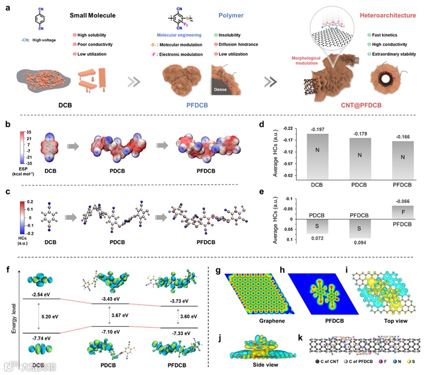 为解决聚合物电极材料活性位点利用率低和导电性差等问题,通过简易的原位聚合方法构建碳纳米管/氟化氰基聚合物复合核壳异质结构电极材料,其中氟化氰基聚合物纳米片交织生长在碳纳米管表面。碳管内核可以提高电子的传递效率,互连网状的氟化氰基聚合物纳米片可以促进离子的扩散以及增加活性位点的暴露。得益于这种有利的分层异质结构,复合电极材料实现了高可逆容量、高倍率性能以及优异的循环稳定性。