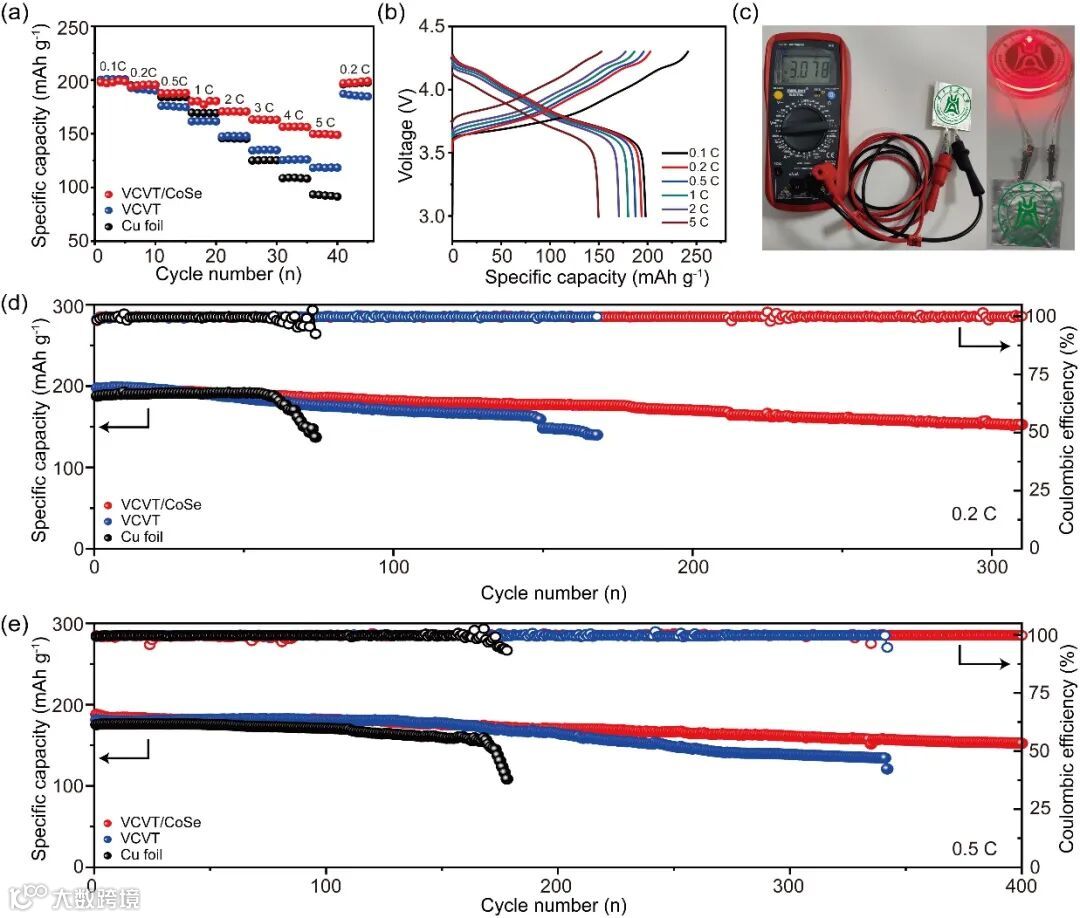 图6. (a)不同负极与NCM0.83正极匹配的全电池倍率性能。(b)Li/VCVT/CoSe||NCM0.83全电池的充放电曲线。(c)软包电池照片。全电池在(d)0.2 C 和(e)0.5 C 的长循环性能。