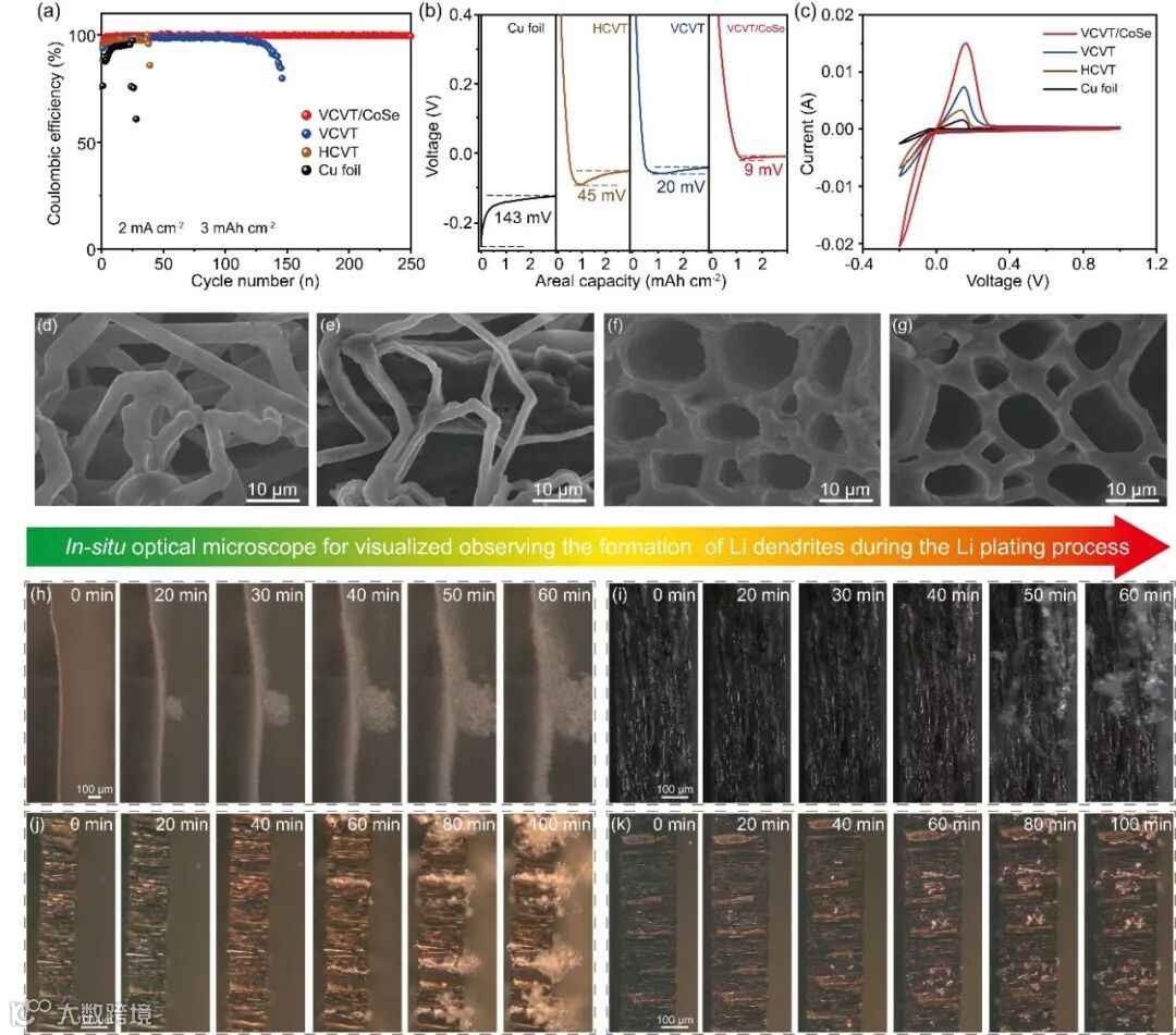 图3:(a)使用铜箔、HCVT、VCVT、VCVT/CoSe集流体组装半电池的库伦效率。(b)放电曲线。(c)CV曲线。(d)铜箔,(e)HCVT,(f)VCVT,(g)VCVT/CoSe集流体沉积3 mAh cm-2锂时的平面SEM图像。(h)铜箔,(i)HCVT,(j)VCVT,(k)VCVT/CoSe集流体锂沉积过程中的原位光学显微镜照片。