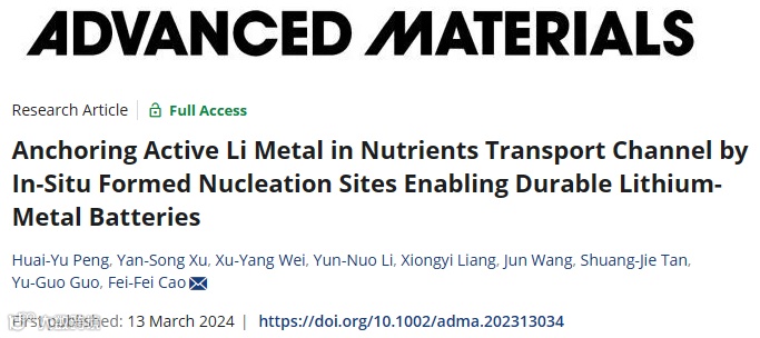 近日,来自华中农业大学的曹菲菲教授在国际材料著名期刊Advanced Materials上发表题为”Anchoring Active Li Metal in Nutrients Transport Channel by In-Situ Formed Nucleation Sites Enabling Durable Lithium-Metal Batteries”的研究文章。该文章受植物天然营养运输结构的启发,在椴木碳材料的垂直孔道内部均匀负载亲锂位点,设计并制备出一种能够高效诱导金属锂均匀沉积的复合负极集流体(VCVT/CoSe)。椴木碳本征的三维孔道结构具有充足的储锂空间,可以有效缓解锂金属沉积/剥离过程中引起的体积膨胀;负载的亲锂位点能够有效均匀化锂离子流、提升锂离子传输动力学,抑制锂枝晶生长,实现了锂金属电池在大沉积面容量下的长时间稳定运行。