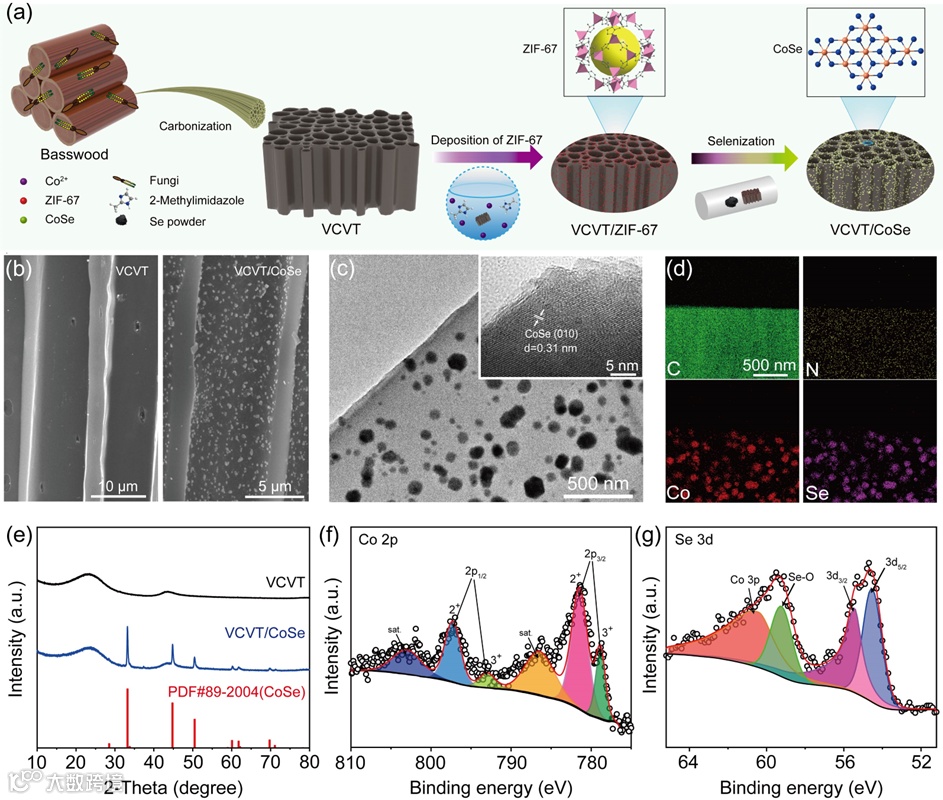 图2:(a)VCVT/CoSe的材料制备示意图。(b)VCVT和VCVT/CoSe的截面SEM图像。(c)VCVT/CoSe的TEM和HRTEM图像。(d)VCVT/CoSe的EDS元素分布图谱。(e)VCVT和VCVT/CoSe的XRD谱图。VCVT/CoSe的(f)Co 2p和(g)Se 3d 高分辨XPS谱图。