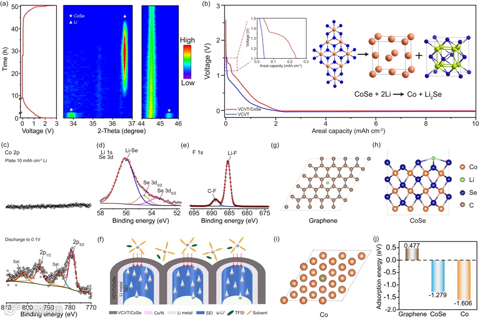 图5.(a)Li/VCVT/CoSe的首圈充放电原位XRD谱图。(b)放电曲线和VCVT/CoSe转化机理图。Li/VCVT/CoSe的(c)Co 2p,(d)Li 1s和Se 3d和(e)F 1s的高分辨XPS谱图。(f)锂沉积在VCVT/CoSe集流体的实际图。(j)一个锂原子吸附在(g)石墨,(h)CoSe,(i)Co上的吸附能比较。