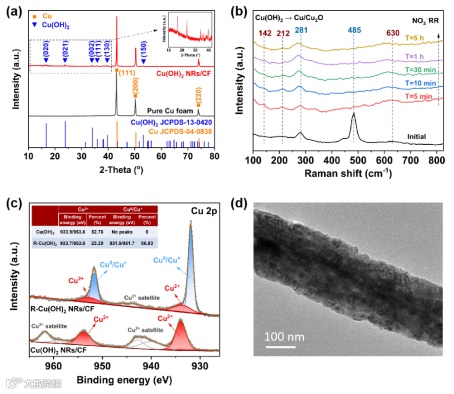 图1. Cu(OH)2纳米电极的结构表征:(a) XRD图,(b) Raman 图,(c) Cu 2p XPS图和(d) TEM图