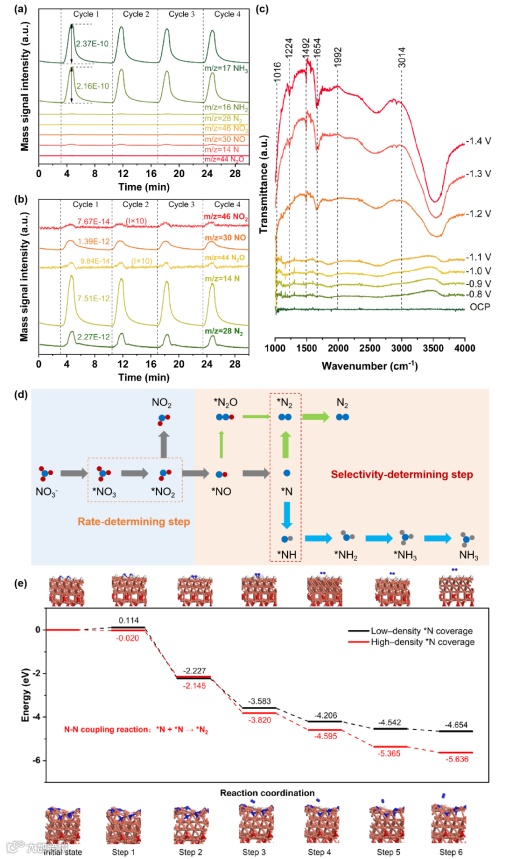 图 5. 机理研究和 DFT 计算。(a) 在线差分电化学质谱和 (b) 部分放大质谱;(c) 重构Cu(OH)2纳米电极电化学硝酸盐还原过程中电位从−0.5 V升至−1.4 V vs Ag/AgCl的原位傅立叶变换红外光谱;(d) 传统电化学反应器中电催化硝酸盐还原机理示意图;(e) 关键中间体*N覆盖密度低/高下N−N 耦合反应(*N + *N → *N2)的能垒差异