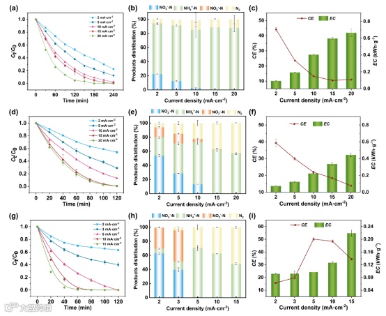 图 2. (a-c) 传统电化学反应器(d = 3 cm)、(d-f) 零极距电化学反应器(d = 3 mm)和 (g-i) 零极距电化学反应器(d = 0.1 mm)的电催化硝酸盐还原性能:不同电流密度下的硝酸盐转化效率、产物分布、电流效率和能耗