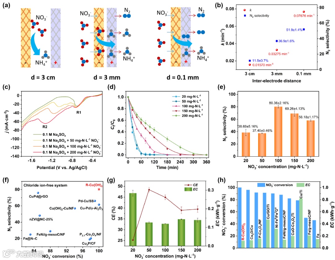 图 4. (a) 电极间距对电催化硝酸盐还原产物分布的影响示意图;(b) 电极间距对还原动力学和 N2 选择性的影响;(c) 不同NO3−浓度电解液中的 LSV 曲线;(d) 不同NO3−浓度下的硝酸盐转化率;(e) 不同NO3−浓度下的N2选择性;(f) 无氯电催化系统中铜基催化剂的N2选择性比较;(g) 电流效率和能耗;(h) 零极距电催化系统与其他电催化系统的硝酸盐转化率和能耗比较
