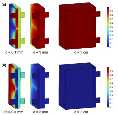 图 3. 有限元模拟结果。三个流通式电化学反应器中(a) NO3−反应物和(b) N2产物的密度分布(相对于入口)。含硝酸盐的电解质从左侧阴极流向右侧阳极