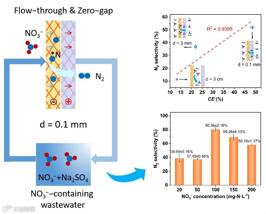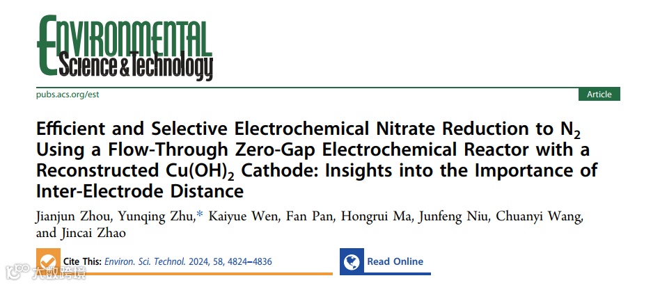 Zhou, J.; Zhu, Y.; Wen, K.; Pan, F.; Niu, J.; Wang, C.; Zhao, J. Efficient and Selective Electrochemical Nitrate Reduction to N2 Using a Flow−Through Zero−Gap Electrochemical Reactor with a Reconstructed Cu(OH)2 Cathode: Insights into the Importance of Inter−Electrode Distance. Environ. Sci. Technol. 2024, 58, 4824−4836.