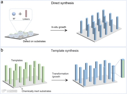 图2 MOF基纳米阵列的一步合成和模板诱导合成策略。