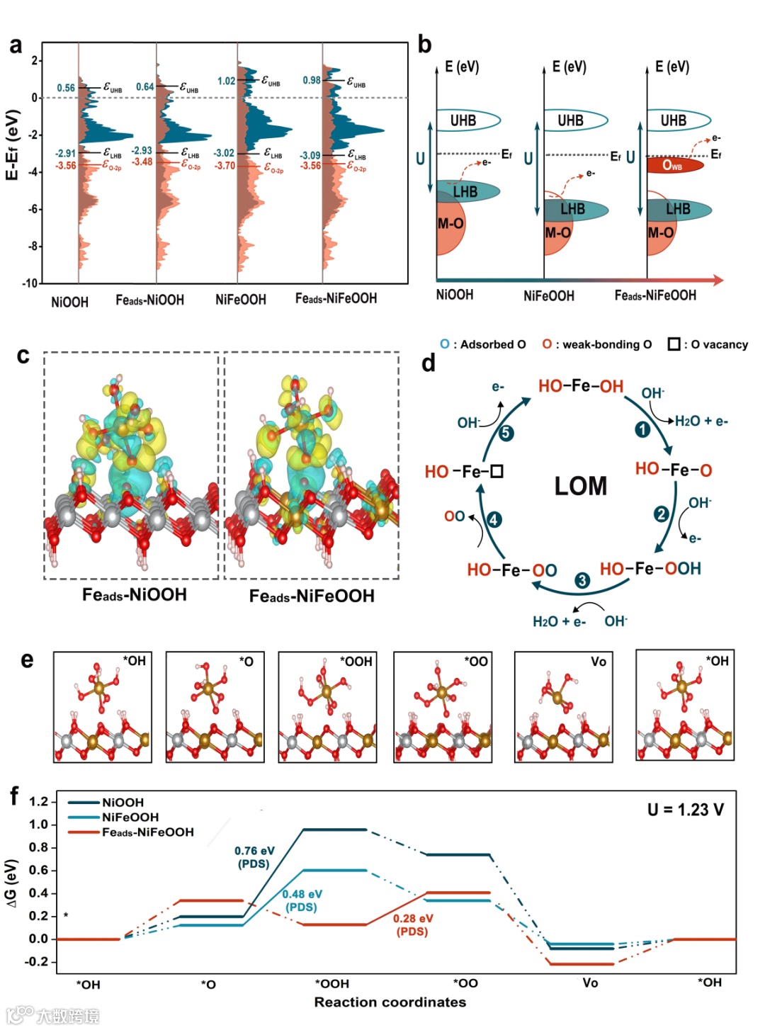 DFT理论计算揭示了表面吸附的Fe(OH)6物种会使Feads-NiOOH和Feads-NiFeOOH的O 2p带中心上移,从而使得电子更容易从弱键合的O (OWB) 释放,避免了NiFeOOH通过LOM路径导致的金属-氧键的断裂,从而减少了内层晶格氧的消耗,保证了结构稳定和活性的持续稳定。