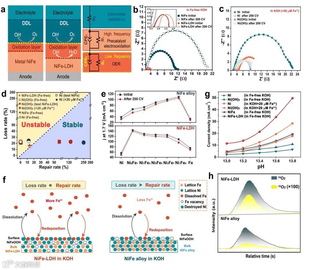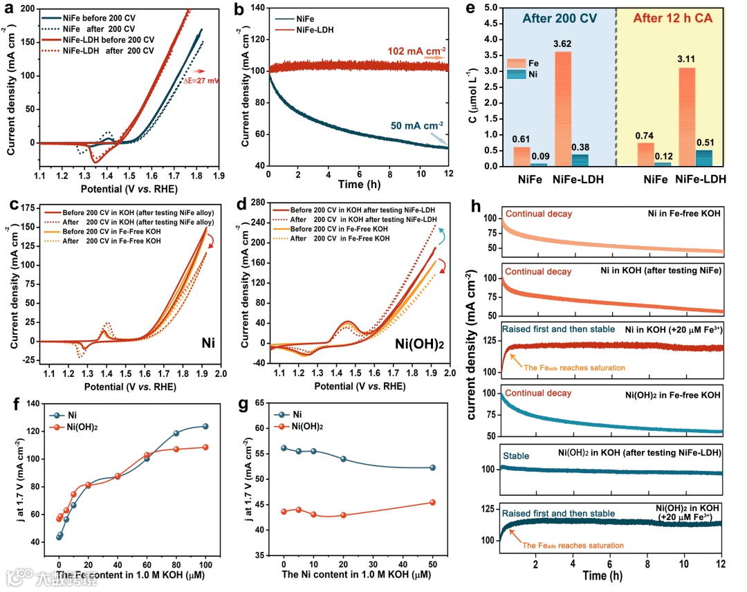 电化学阻抗谱(EIS)表明,NiFe-LDH的表面形成了较厚的活性氧化层,相比NiFe合金,这有利于提高OER的动力学性能。同时,活性氧化层中的吸附的Fe物种能够有效地促进电子转移,缓解氧化层在OER过程中的动力学劣化,但是,NiFe-LDH在OER过程中并不是固有稳定的,当电解液中溶出的铁浓度较低时,其活性会逐渐降低。只有当电解液中溶出的铁浓度足够高,才能实现铁的动态交换,维持活性修复与损失的平衡。