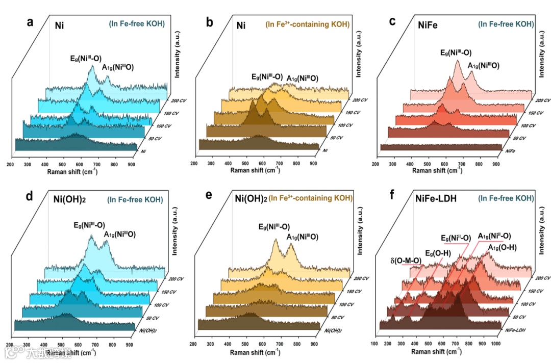 利用准原位拉曼光谱技术,系统地研究了不同材料(纯Ni、NiFe合金、Ni(OH)2和NiFe-LDH)在含铁和不含铁的KOH电解液中表面物种随CV次数的变化。发现在含铁的KOH电解液中,Ni和Ni(OH)2的表面NiOOH信号随着CV次数的增加而逐渐减弱。这一现象表明,溶液中的铁会在表面吸附和沉积,覆盖NiOOH层,从而干扰NiOOH的拉曼信号。对于NiFe-LDH,其表面信号峰在多圈CV循环后基本保持不变,但强度逐渐下降。值得关注的是,并未观察到NiOOH的信号,这表明在NiFe-LDH中较高的Fe掺杂有利于其Ni2+的可逆还原,缓解了高价Ni的过度积累导致的失活。强度逐渐下降的现象类似于Ni和Ni(OH)2上的含铁物种的吸附导致的NiOOH信号强度的降低,表明NiFe-LDH在CV过程中部分铁从体相溶解到电解液中并重新沉积到NiFeOOH的表面。