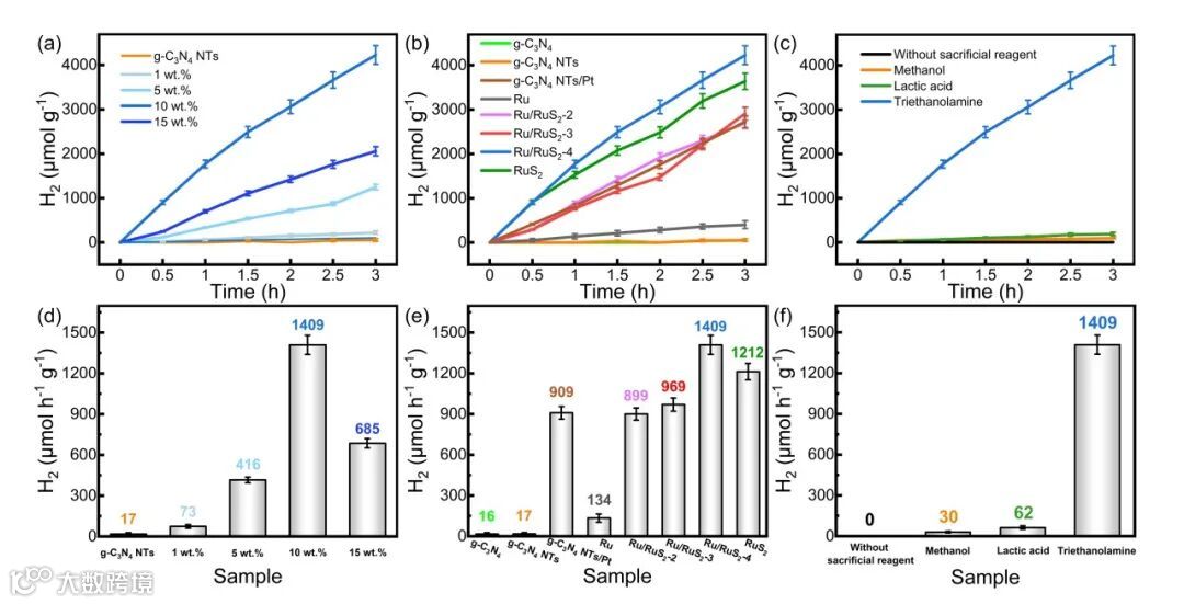 要点二:Ru/RuS2/g-C3N4NTs显示出增强的光催化产氢活性(1409 μmol·g−1·h−1)。