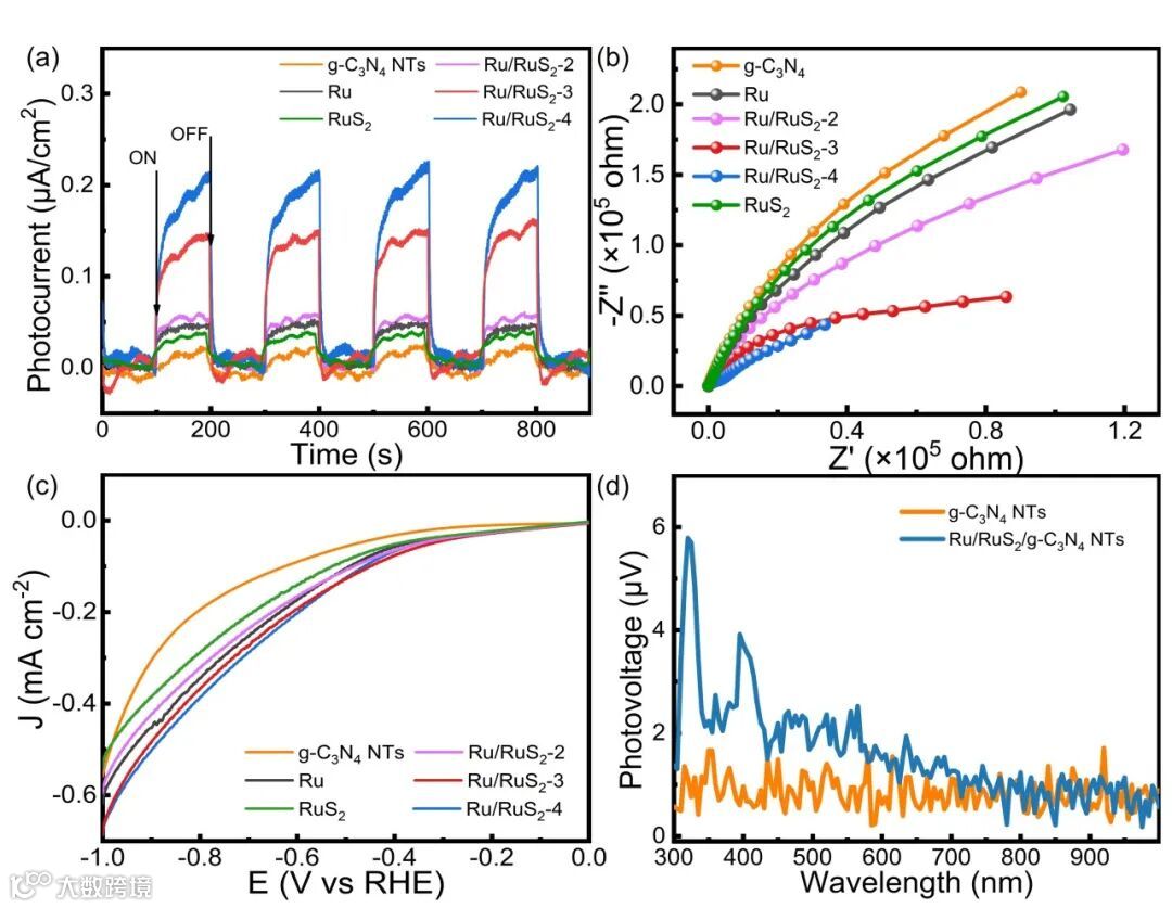 图5. g-C3N4NTs和Ru/RuS2/g-C3N4NTs的TPC、EIS、LSV和SPV谱图。