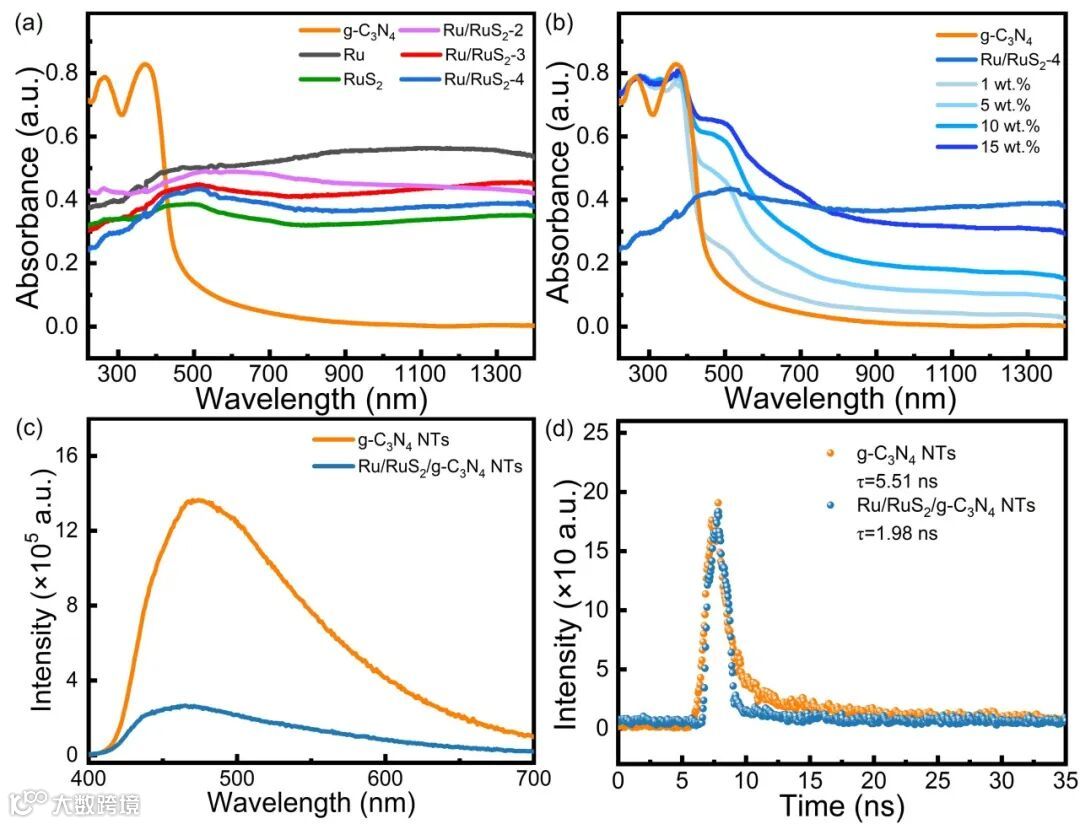 图4.Ru/RuS2、g-C3N4NTs和Ru/RuS2/g-C3N4NTs的UV-Vis DRS、稳态和时间分辨PL光谱。