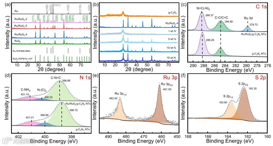 图2. Ru/RuS2/g-C3N4NTs的XRD与XPS图谱。