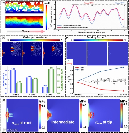 图4. 基于多物理场仿真的界面机理研究:(a)填料的离子导通能力对负极表面Li+浓度分布的影响。(b)锂枝晶的生长模式与凝胶电解质弹性模量之间的关系。(c)锂离子沉积速率与凝胶电解质弹性模量之间的关系。(d)受凝胶电解质机械约束的锂枝晶应力演化。