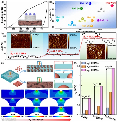 图1.(a)PLF@GPE整体力学性能。(b)不同文献中凝胶电解质离子电导率和弹性模量的比较。(c)AFM表征的凝胶电解质弹性模量二维分布图。(d)根据增强填料形貌结构提取的数值模型。(e)基于力学仿真的凝胶相增强机制。
