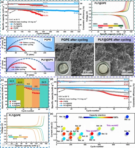 图3.(a)LFP||Li电池在0.5C电流倍率下的循环性能。(b)循环实验后半电池界面阻抗的变化以及循环后负极表面形貌的比较。(c) LFP||Li电池的倍率性能比较。(d) 高负载正极LFP||Li电池的循环性能比较。(e) 与其它文献中凝胶电解质循环性能的比较。