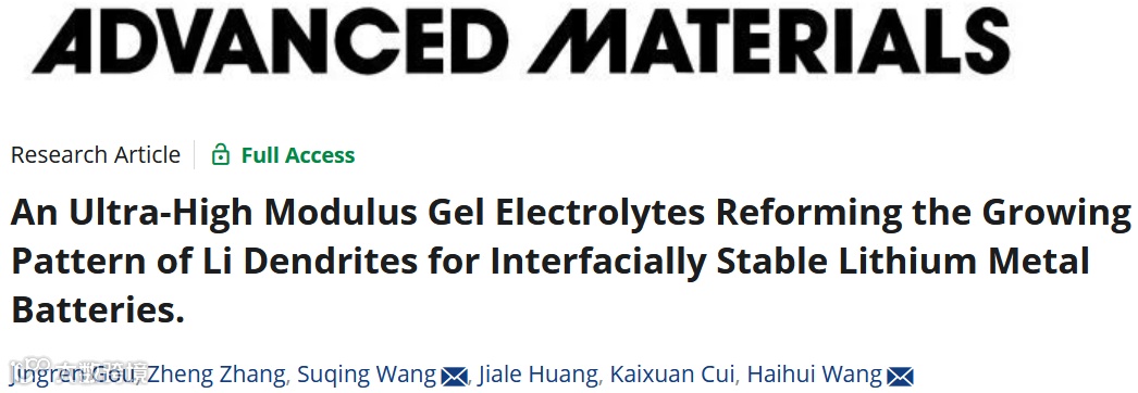 Jingren Gou, Zheng Zhang, Suqing Wang,* Jiale Huang, Kaixuan Cui, Haihui Wang,* An Ultra-High Modulus Gel Electrolytes Reforming the Growing Pattern of Li Dendrites for Interfacially Stable Lithium Metal Batteries, Advanced Materials, 2309677.