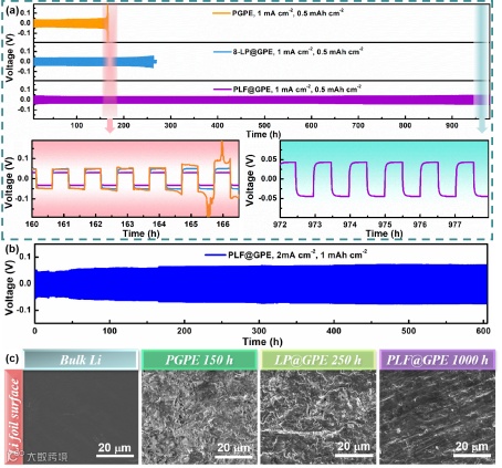 图2. 凝胶电解质锂对称电池的锂剥离/沉积行为:(a)1mA cm-2电流密度下锂对称电池的循环性能以及电压随时间的变化曲线。(b) 基于PLF@GPE的锂对称电池在2mA cm-2电流密度下的循环性能。(c) 循环实验后,锂负极的表面形貌。