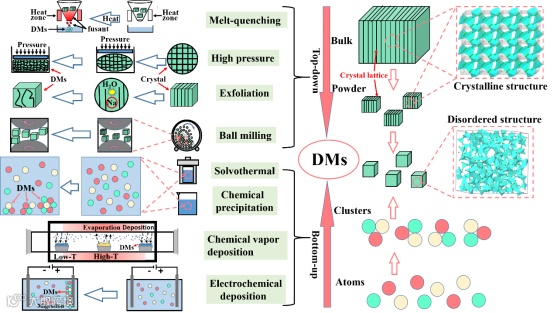 本文给出了DMs的详细定义,并讨论了其与非晶材料(Amorphous material)的异同点。DMs的制备方法按其组装模式一般可以分两类,即“自下而上”和“自上而下”的方法。如图2所示,“自下而上”法是通过降低反应能量和/或时间等方式,从原子水平形成DMs的方法,如化学沉积、溶剂热、化学气相沉积(CVD)和激光沉积以及电化学沉积。相比之下,“自上而下”法是通过熔融淬冷、高压、剥离、球磨等手段,从块状晶体水平破坏原有晶体结构从而获得DMs的方法。